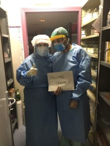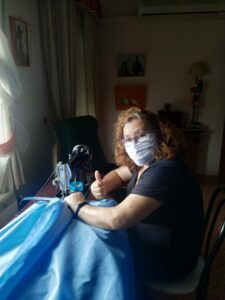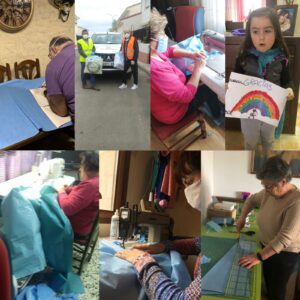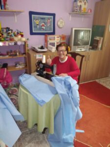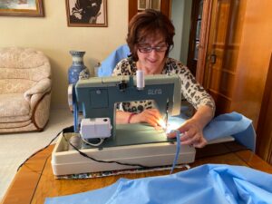 No se entregaron batas las costureras no pararon, y esta mañana Enrique ha ido a recoger las 186 que Ana y sus vecinas han estado preparando estos días en Nuevo Baztán. Siguen siendo muy necesitadas, hasta tal punto que hace un rato, después de terminar su trabajo en el Hospital de Getafe, Keka y una compañera se han hecho 55 Km con sus coches para venir hasta nuestro trabajo y entregarnos 2000 telas más y recoger las 186 batas de Nuevo Baztán. Están muy agradecid@s por el trabajo de tod@s.
